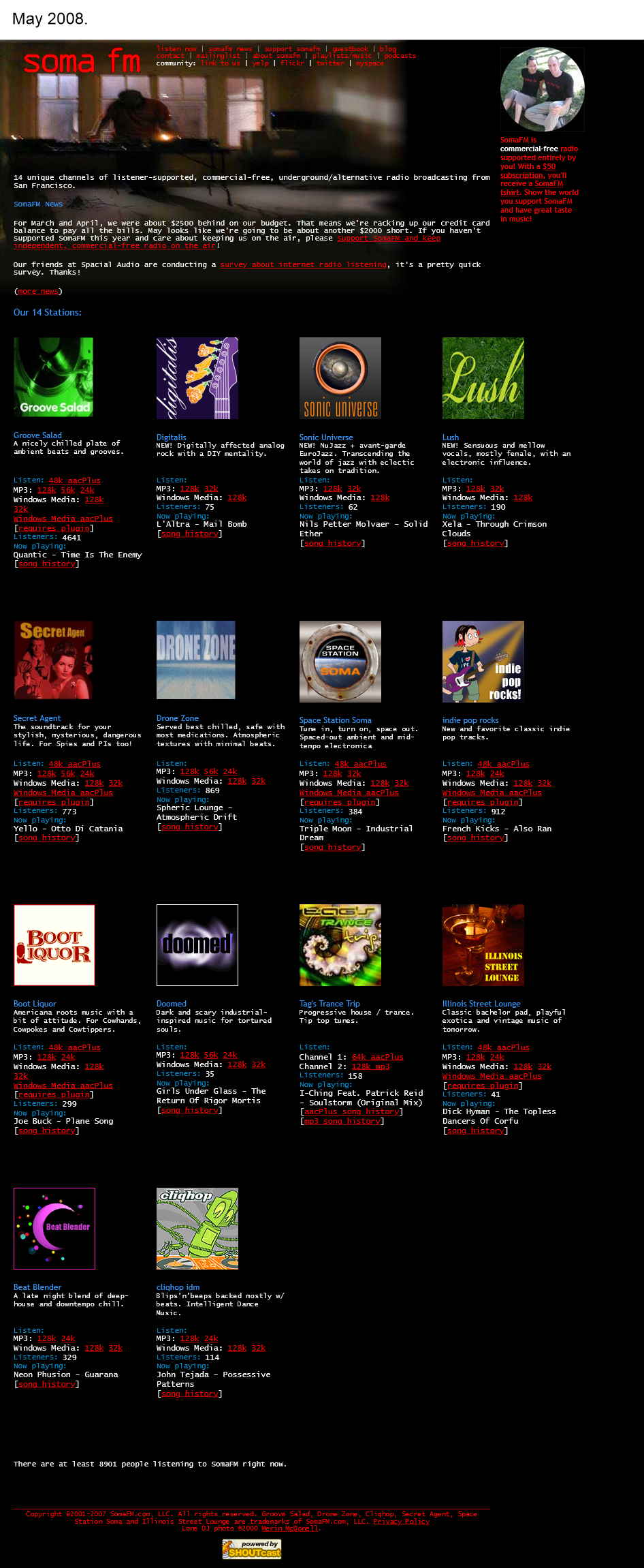 Pic 4: There were some Soma FM stations I liked: Groove Salad, Drone Zone, Illinois Street Lounge - and sometimes I tried Cliqhop. This was their site in that era. Not much has changed about it.