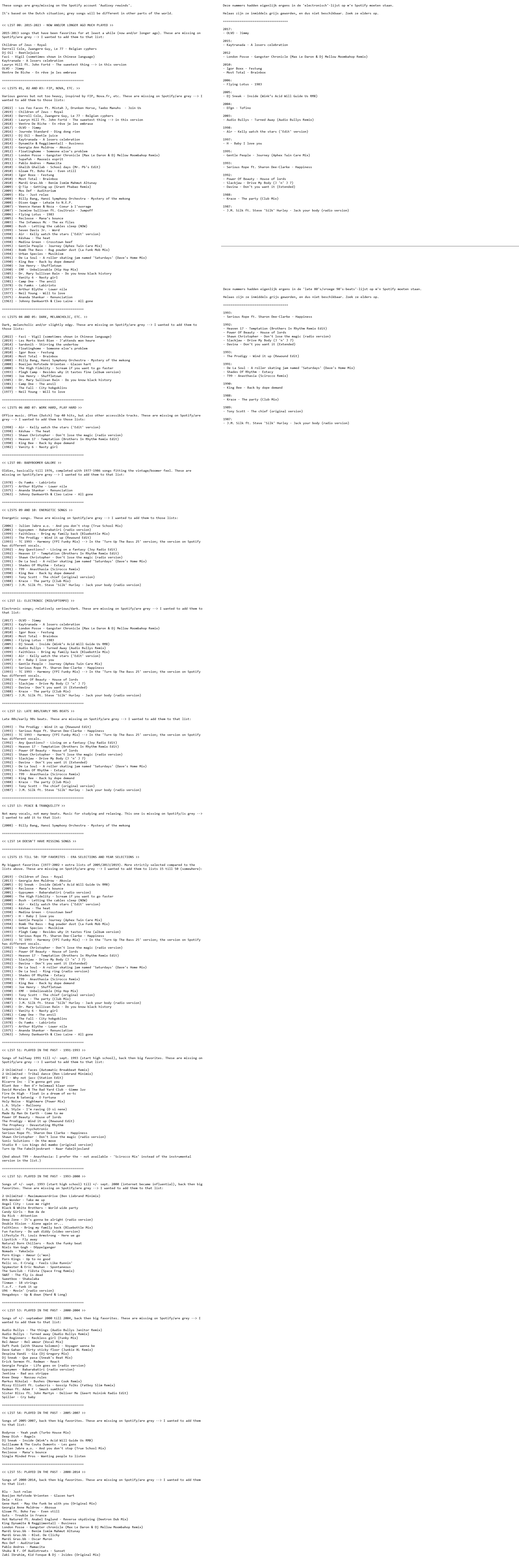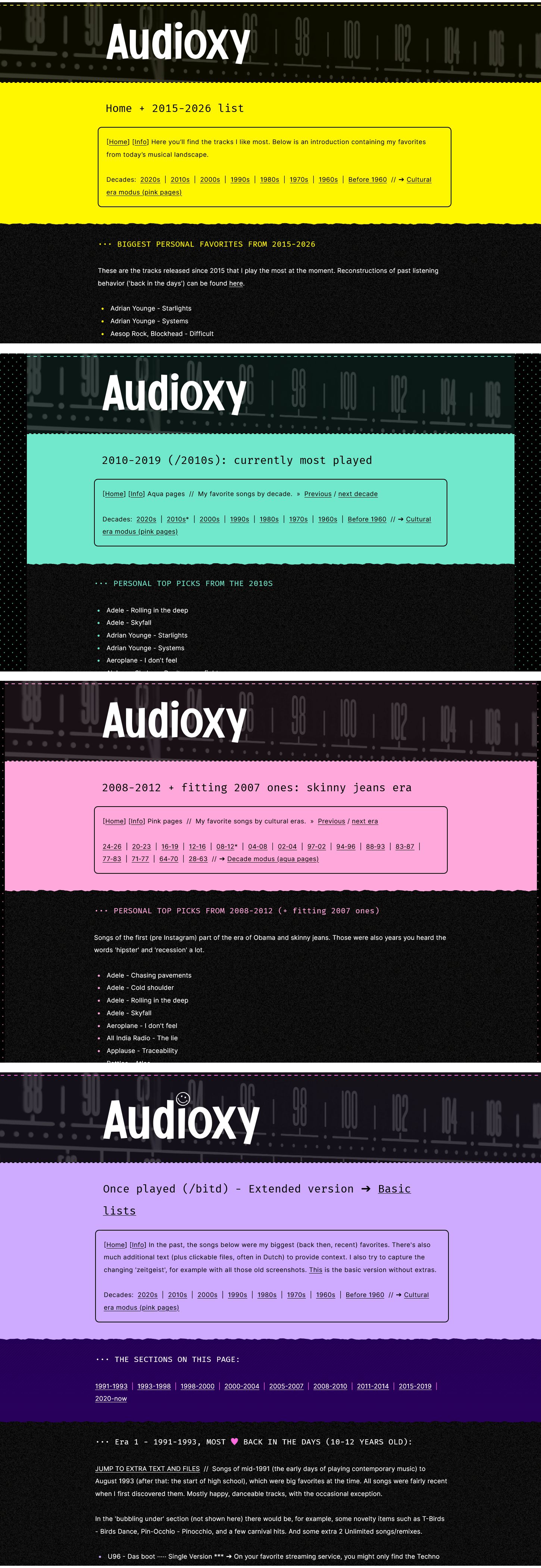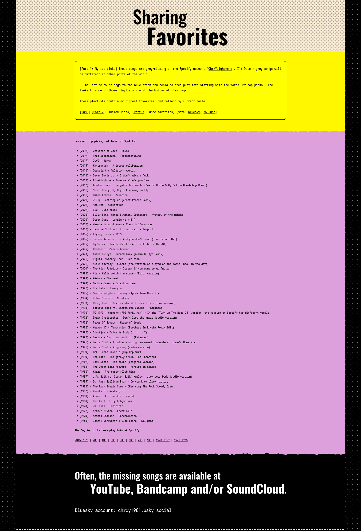 ⟶ Pic: This website, late in 2025 and early in 2026. The current design dates from February 2026. | Pic 2: The idea of resuming my personal music sites originally grew out of the simple text files I had on my domain around 2024, listing tracks that weren’t available on Spotify. I used to place the URLs above my Spotify playlists. As a 'real' website, the lists could be designed and presented much more effectively. | Pic 3: In the spring of 2025 I created this basic html site featuring the same contents.